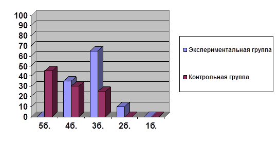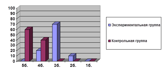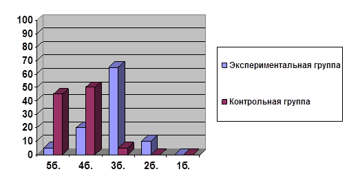 Данные наглядно отображают результаты балльной оценки детей при исследовании активного номинативного словаря. Исходя из данных, можно сказать, что дети справились с этим заданием хуже, чем с заданием на исследование пассивного номинативного словаря. Пяти баллов не набрал ни один ребенок из ЭГ, в отличие от детей КГ, в которой пять баллов получила почти половина группы (45% детей) (диаграмма 4). Наиболее трудными темами активного словаря существительных для детей ЭГ явились: «Рыбы», «Деревья», «Ягоды», «Дикий птицы», «Домашние птицы», «Цветы», «Транспорт», «Время суток», «Головные уборы», «Инструменты».