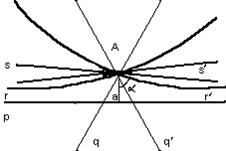 . Параллельные прямые определяются как такие, которые не пересекаются, но могут быть получены предельным переходом из пересекающихся. Через каждую точку плоскости проходят две прямые, параллельные данной прямой, лежащей в этой плоскости; эти прямые делят пучок прямых, проходящих через данную точку, на четыре области, в двух из которых проходят прямые, пересекающие данную прямую, а в двух – прямые, которые не пересекают эту прямую и не могут быть получены предельным переходом из пересекающихся – такие прямые называются расходящимися; параллельные прямые разграничивают пресекающие прямые от расходящихся (на рис. условно изображены прямые