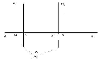 Доказательство: имеем ММ1 перпендикулярно АВ, NN1 перпендикулярно АВ. Докажем, что перпендикуляры ММ1 и NN1, проведенные к одной и той же прямой АВ, не могут пересечься. Предположим противное, а именно - что перпендикуляры ММ1 и NN1 пересекутся в некоторой точке О, тогда получиться треугольник МОN, в котором сумма внутренних углов 1 и 2, равна двум прямым: 1+2=180º, что невозможно, так как сумма двух углов треугольника всегда меньше 180º. Отсюда следует, что принятое допущение, что перпендикуляры ММ1 и NN1 при своем продолжении пересекутся в некоторой точке О, неверно. Итак, два перпендикуляра к одной и той же прямой не пересекутся, сколько бы их не продолжать.