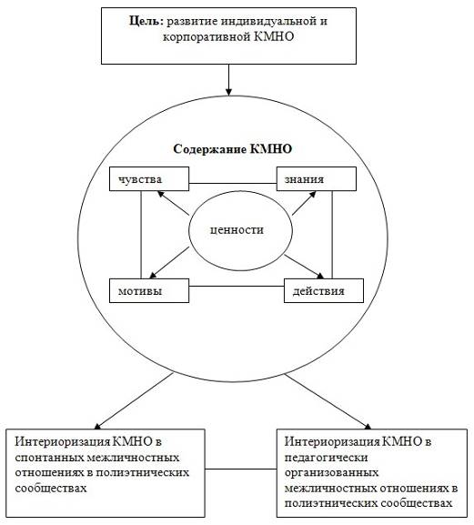 Системообразующим фактором системы является её цель – развитие КМНО. В соответствии с целью определяется содержание КМНО, включающее в себя ценностный, чувственный, знаниевый, мотивационный и деятельностный аспекты. В свою очередь, духовные ценности и ценностные ориентиры каждого субъекта полиэтнического сообщества определяют его чувственный, знаниевый, мотивационный и деятельностный (поведенческий) компоненты. Если для человека духовные ценности и культура других народов имеет личную значимость, то и его эмоциональные проявления, знания, мотивы поведения и действия будут стремиться соответствовать этим ценностям.
