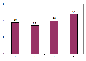 Результаты первого опроса наглядно продемонстрированы на рис. 1., где ось " Х"- вид задания, вопроса, ось " У" -средний балл.