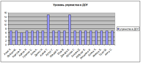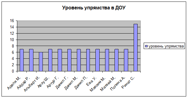 Результаты исследования по проявлению упрямства в дошкольном образовательном учреждении в старшей группе отражены в таблице № 2. В эксперименте участвовало 13 детей старшего возраста: Аделя М., Айдар Р., Альберт И., Арзу Ш., Артур Г., Данил Г., Данил М., Данил П., Ева У., Максим А., Матвей М., Полина А., Ринат С.