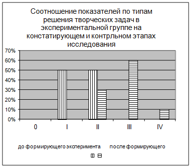 Из таблицы видно, что в исследуемой группе детей прослеживаются значительные изменения показателей после проведения формирующего эксперимента. Так на констатирующем этапе исследования для данной группы детей был характерен I и II тип решения творческих задач: 50% / 50%, а после формирующего эксперимента ведущим типом решения творческих задач стал III тип: 60%, т.е. тип «Сюжеты». При этом типе решения дети не только изображают отдельные объект, но и включают его в воображаемый сюжет. Для одного из детей данной группы характерен IV тип решения задач «включение». При этом типе заданная фигура используется качественно по–новому, в данном случае фигура включается как один из второстепенных элементов воплощаемого ребенком образа воображения. Использование такого образа направляет ребенка на дифференцированное и индивидуальное решение задачи.