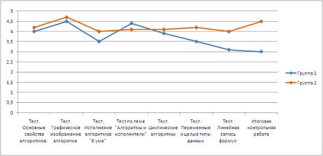 Для проверки гипотезы обеим группам на протяжении всего обучения предлагалось написать тесты по пройденному материалу, после чего полученные результаты суммировались, и выводилось среднее арифметическое для каждой группы по каждому тесту. По итогам проведения данного контрольно-измерительного мероприятия было получено следующее соотношения средних баллов по двум группам: