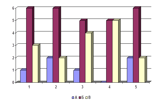 Сравнивая диаграммы 4 и 5 можно отметить разницу в ответах. В первой группе преобладают ответы А и Б, во второй группе – Б и В. Ответы А и В соответствуют крайним выборам, наиболее частые ответы – Б. При этом первые два ответа характеризуют учеников как проявляющих познавательную активность, последний же напротив. Для сравнительной оценки показателей первой и второй групп мы суммируем результаты по первому и второму ответам и выстроим общую диаграмму, которая отразит показатели познавательной активности учеников.
