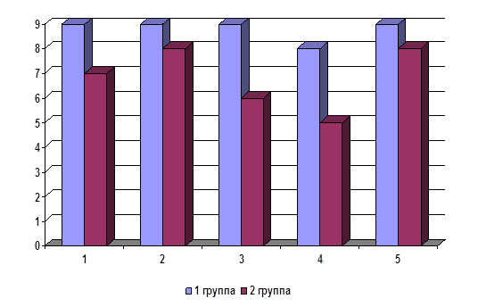 Как видно из таблицы сумма ответов в первой группе превышает сумму ответов второй группы по всем вопросам. Это свидетельствует о том, что более высокий уровень познавательной активности демонстрируют ученики, посещающие факультативные занятия по информатике и ИКТ. Мы сейчас не обсуждаем, чем именно обусловлена эта взаимосвязь, а просто фиксируем полученные результаты. Для наглядности представим данные в виде диаграммы.
