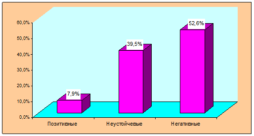 Таким образом, у 57,9% (22) семей взаимоотношения носят неустойчивый характер, т.е. они могут быть и негативными и позитивными в зависимости от ситуации. У 13,2% (5) семей взаимоотношения характеризуются как позитивные, стабильные. У 28,9% % (11) семей взаимоотношения негативные. В динамике это выглядит так, Рисунок 5.