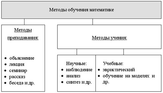 Педагогическая классификация методов обучения разделяет методы преподавания и методы изучения (учения), которые в свою очередь представлены научными и учебными методами изучения математики. [5]