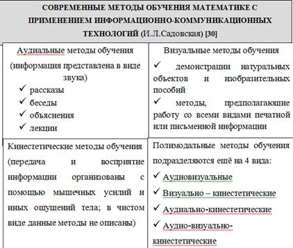 Также, обучение математике не может никак обойтись без различных методов. Классификаций методов обучения имеется огромное множество: от общих педагогических методов до частных, которые используются лишь в обучении математики. На данный момент имеются современные методы. К ним относят: аудиальные, визуальные, кинестетические и полимодальные. Методы обучения нельзя разделить, универсализировать или рассматривать изолированно, так как один и тот же метод обучения может оказаться эффективным или неэффективным в зависимости от условий его применения.