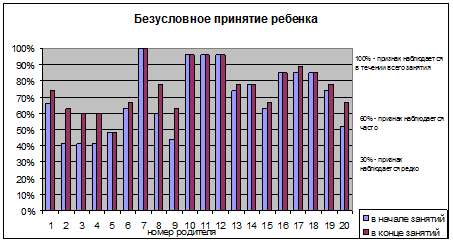 У 30% родителей, изначально имевших средние показатели (проявление безусловного принятия на занятии наблюдалось часто) наблюдается незначительное увеличение параметров – в пределах 10%.