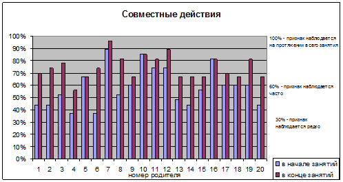 У 55 % родителей наблюдается значительное увеличение совместных действий с ребенком на занятии – в рамках 30%
