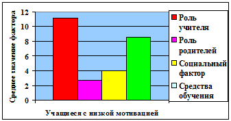 И, наконец, на формирование мотивации к изучению химии у учащихся с низким уровнем мотивации (III группа) в порядке убывания оказали влияние в порядке убывания следующие факторы: профессиональные и личностные качества учителя, средства обучения, социальные факторы, родители (рис. 5).