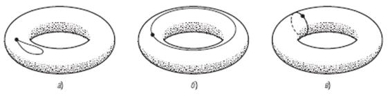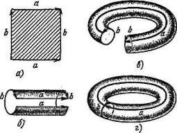 Задача 17. Если попарно склеить противоположные стороны квадрата с учетом указанных на рисунке а направлений, то получится тор (рисунок б, в, г). Какая поверхность получится, если склеивание произвести с учетом направлений на рисунке (сторона с остается не склеенной)?