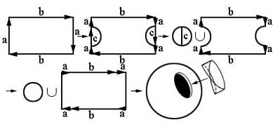 Решение: Изобразим проективную плоскость, затем преобразуем её. Сначала вырежем круг, затем распрямим стрелки для получения развёртки листа Мёбиуса. В результате получим сферу с отверстием, в которое можно «поместить» лист Мёбиуса [32]: