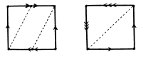 Решение: Два способа склейки бутылки Клейна из квадрата изображены на рис.9. На рис. 10 пунктиром изображены требуемые разрезы для обоих способов склейки [25].