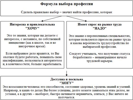 Основная сложность профессионального выбора заключается в правильном определении баланса склонностей, способностей и общественного спроса на ту или иную профессию, а также в сопоставлении психологических качеств индивида с качествами, необходимыми для выбираемой профессии. Поэтому помощь оптанту в определении баланса детерминант: хочу – надо – могу, а также наработке качеств, необходимых для освоения предпочитаемой профессии является основой деятельности профконсультанта. Кратко это можно выразить в следующей формуле:
