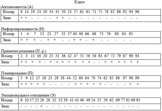 Для определения уровня готовности старшеклассников совершить адекватный профессиональный выбор мы применили диагностическую методику «Профессиональная готовность». Методика представляет собой опросник, состоящий из 99 вопросов. Школьникам было предложено ответить на перечисленные утверждения «да» или «нет» (Приложение 1). Опросник состоит из пяти шкал: автономность – 20 вопросов, информированность – 17 вопросов, принятие решения – 20 вопросов, планирование – 20 вопросов, эмоциональное отношение – 22 вопросов. Ответы подсчитываются по следующему ключу: