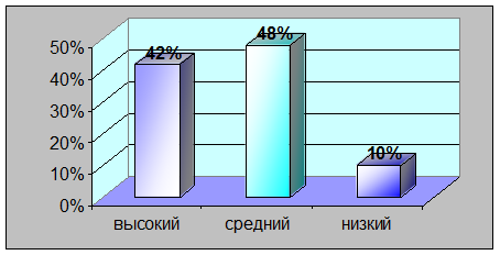 Как видно из рисунка, по данной шкале 42% испытуемых показали высокий уровень автономности, у 48% выявлен средний уровень, тогда как у 10% учащихся обнаружили низкий уровень автономности. Эти результаты показывают, что в целом в данной выборке старшеклассники способны сами решить, какую профессию они хотят получить. Почти половина учащихся уже осознают свою независимость от родителей, они инициативны и изобретательны в реализации своих целей, умеют на достаточном уровне принимать серьезные решения.
