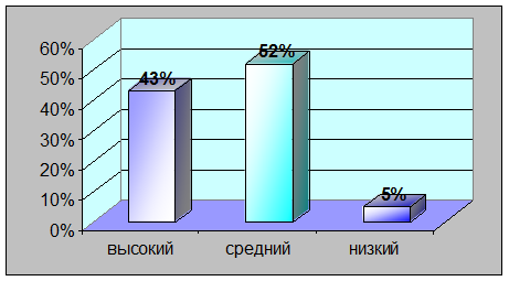 Как следует из рис. 5 высокие показатели имеют 43% старшеклассников, средние – 52%, низкие – 5%. Эмоциональное отношение к ситуации выбора профессии включает в себя не только отношение к различным вариантам при выборе, но и отношение к планированию, к тому, что надо принять какое-то решение, отношение к ответственности за решение и планирование, к тому, что при этом надо проявлять активность, идти на компромисс и т.д. Более половины старшеклассников данной выборки показали средние результаты,