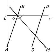 Параллельные прямые АВ и CD пересечены прямой EF, величина одного из внутренних углов при точке О (рис. 1 ) равна 130°. ОМ – биссектриса этого угла. Определить величину угла, образованного ею с прямой CD.