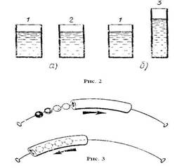 1. Детям демонстрируются два сосуда (рис. 2 , а) одинаковой формы и размеров, содержащие поровну темную жидкость. Дети легко устанавливают равенство жидкостей в первом и втором сосуде. Далее, на виду у детей жидкость из одного сосуда переливают в другой более высокий и узкий (рис. 2 , б) и предлагают сравнить количество жидкости в этом сосуде и оставшемся нетронутым. Дети утверждают, что в новом сосуде жидкости стало больше.