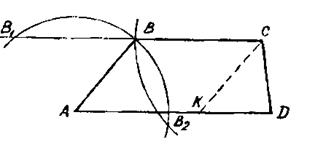 3) Если провести прямую СВ||DА и на ней найти точки В и В1, отстоящие от А на расстоянии, равном боковой стороне, то в этом случае точка В1 будет посторонней и лишь точка В будет искомой, причем доказательство (ВС = АК) уже усложняется.