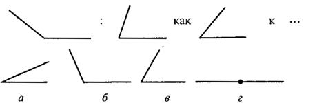 В первом субтесте («аналогия») испытуемому предлагается три однородных геометрических объекта. Между первым и вторым объектами имеется определенная связь, которую испытуемый должен выявить. Сообщается, что между третьим и одним из четырех объектов, предлагаемых на выбор, существует аналогичная связь. Испытуемый должен найти из четырех объектов тот, который соответствует по аналогии третьему. Этот субтест содержит четыре варианта заданий, отличающихся типом геометрических объектов, каждый из которых представлен в трех различных видах.