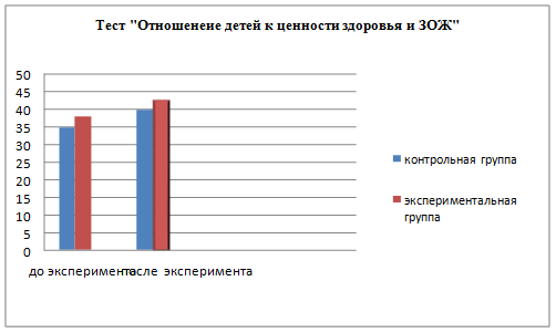 По результатам в тесте «Отношение детей к ценности здоровья и здорового образа жизни» в начале эксперимента в контрольной группе мы получили следующие баллы-35б, в экспериментальной группе-38б. В конце эксперимента в контрольной группе составил-40б, в экспериментальной группе-43б.