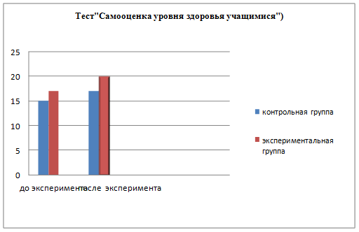В тесте «Самооценка уровня здоровья учащимися» в начале эксперимента, в контрольной группе составил-15б, в экспериментальной группе-17б. В конце эксперимента в контрольной группе составил -17б, в экспериментальной группе-20б.