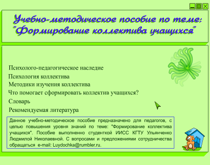 На ней отражено содержание пособия, а именно следующие разделы: психолого-педагогическое наследие, психология коллектива, методики изучения коллектива, раздел, отражающий методы, помогающие сформировать коллектив учащихся, словарь и список рекомендуемой литературы. Она содержит информацию об авторе и адрес сотрудничества, а также два анимационных объекта: знак Ψ, который движется и мультипликационный объект, который движется при наведении курсора на названия раздела.