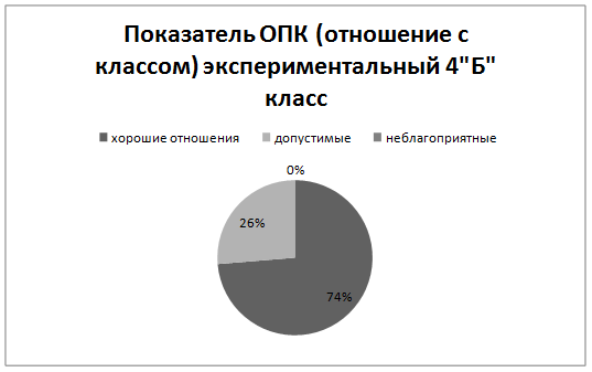 Рассмотрев диаграммы показателя ОПК (отношения с классом), мы можем сделать вывод, что в экспериментальном классе показатели улучшились. У 74% хорошие отношения с классом, у 26% детей допустимые отношения с классом и полностью отсутствуют неблагоприятные отношения с классом. В контрольном классе изменений не произошло.