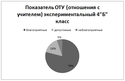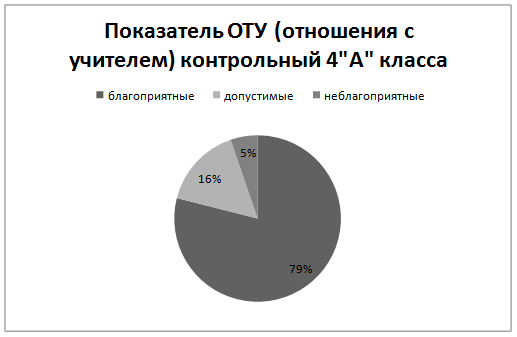 Рассмотрев диаграммы показателя ОПУ (отношения с учителем), можно заметить что и отношения с учителем также улучшились. В экспериментальном классе: у 79% хорошие отношения с учителем, у 16% детей допустимые отношения с учителем и у 5% класса неблагоприятные отношения с учителем. В контрольном классе изменений не замечено.