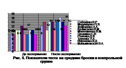 Контрольная группа не показала такой результативности как экспериментальная. Её среднее арифметические значение составило 9.3 и 13 процентов до и после эксперимента соответственно (Рис. 6). Лучший показатель до эксперимента – 12, после – 16 (Рис. 5). Если сравнивать этот показатель с экспериментальной группой, то превосходство экспериментальной группы будет налицо.